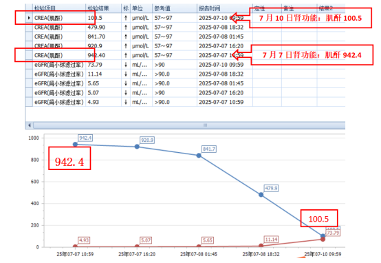 在接下来的三天里,龙利带领团队为夏师傅制定了针对性的治疗方案:中医内服活血化瘀、降浊排毒;西医则补液、护肾、纠正酸中毒和电解质紊乱。夏师傅的尿量逐渐恢复,第三天复查时,肌酐值从942.4umol/L 骤降至100.5umol/L,肾功能恢复正常。