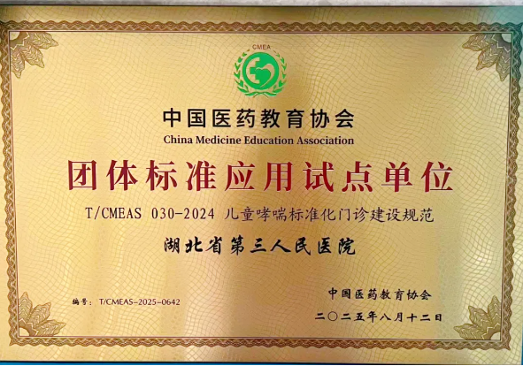 近日,在中国医药教育协会儿科专业委员会2025年度学术会议期间,《儿童哮喘标准化门诊建设规范》团体标准应用试点单位工作会议同步召开。会议对首批入选的试点单位进行了集中授牌。其中,湖北省第三人民医院儿童医疗中心成功入选,并现场接受授牌。