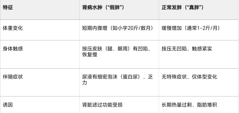 很多人像小宇一样,把肾病水肿误认成“发福”,其实二者区别很明显: