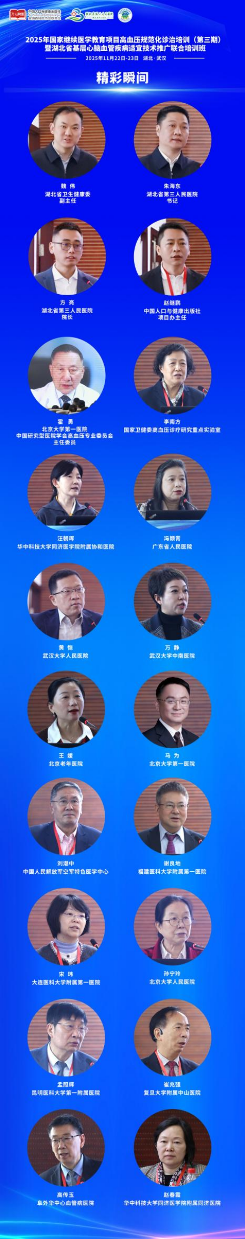 为贯彻国务院关于《医疗卫生强基工程实施方案》相关政策要求,落实国家卫健委《关于加强基层慢性病健康管理服务指导意见》,积极推动慢性病健康管理高血压规范化诊疗技术下沉基层,提升全国心脑血管疾病防治能力。由湖北省卫生健康委员会作为指导单位,中国人口与健康出版社联合湖北省第三人民医院、中国研究型医院学会高血压专业委员会共同主办的“2025年国家继续医学教育项目高血压规范化诊治培训(第三期)暨湖北省基层心脑血管疾病适宜技术推广联合培训班”,于11月22日—11月23日在湖北省武汉市圆满落幕,此次活动紧密围绕医疗强基工程核心政策,来自全国20余个省份近 300名基层医疗卫生工作者齐聚,共探高血压诊疗前沿与基层实践路径。